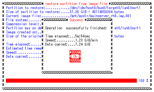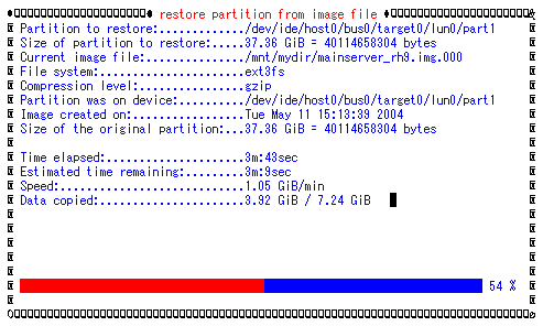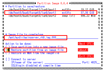 「Image file to create/use」の項目で、バックアップしたイメージファイルを指定するが、バックアップ時に自動ファイル分割を選択した場合は、指定してファイル名の後ろに自動的に「.000」〜の追番が付与されているので、「/mnt/mydir/mainserver_rh9.img..000」ように最初のファイルを指定する。