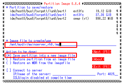 指定方法は、「/mnt/mydir/(任意のファイル名)」と指定する。例えば、 /mnt/mydir/mainserver_rh9.img