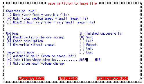 - 次画面では、「Compression level」で圧縮の有無、および圧縮方法の指定(デフォルトはgzip圧縮)や、終了後の処置、自動ファイル分割等を指定する。基本的にはデフォルトで問題ないはずなので、指定が終了したら再度F5キーを押す。
