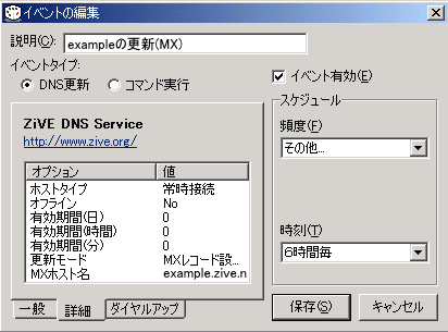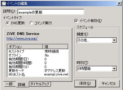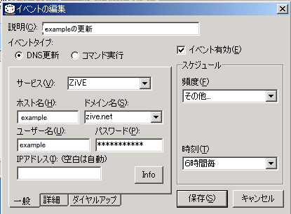 - DiCEを起動して、[イベント]→[イベント編集]で、「イベントタイプ:DNS更新」、「サービス:ZIVE」、「ホスト名」、「ドメイン名」、「ユーザ名」、「パスワード」を設定。「スケジュール」で更新間隔を設定するが、ZIONに負荷をかけたくないこと、最近は回線も切れない(開通当初はひんぱんに切れた)こと、次項の「IPアドレス監視機能」があるため、おやじは6時間とした。