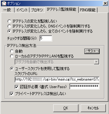 - [オプション]→[オプション]→[IPアドレス監視機能]で、「IPアドレスが変化したら、DNSイベントを強制実行する」にチェックし、「チェック間隔:5分(最短)」、「IPアドレス検出方法」を自動に設定。「テスト」ボタンでIPアドレスが検出できることを確認する。
