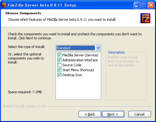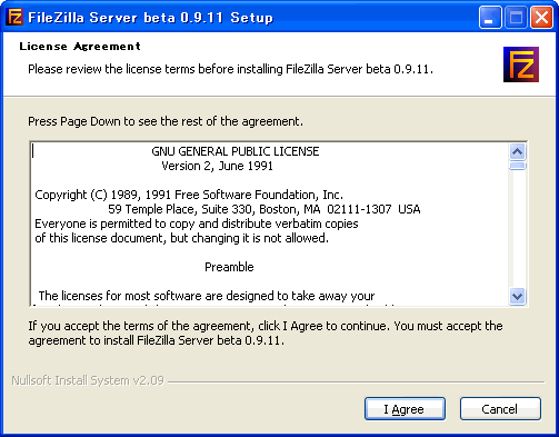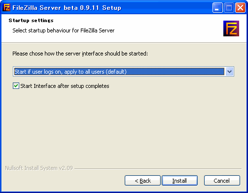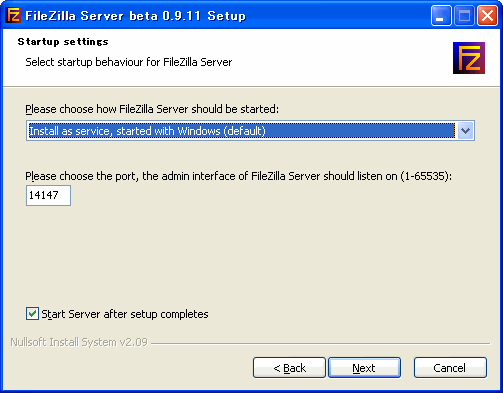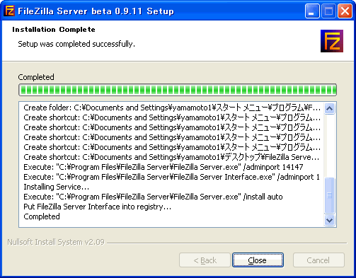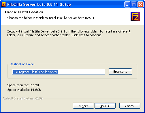 - ダウンロードしたFileZilla_Server-0.9.11.exeを実行し、インストールする。