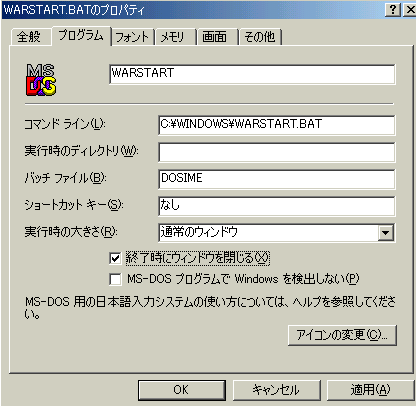 設置後、各バッチファイル上で右クリックし、「プロパティ」を開き、「プログラム」の「終了時にウインドウを閉じる」にチェックを入れてください。これを行わないと、Dosウインドウが閉じません。