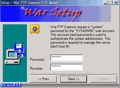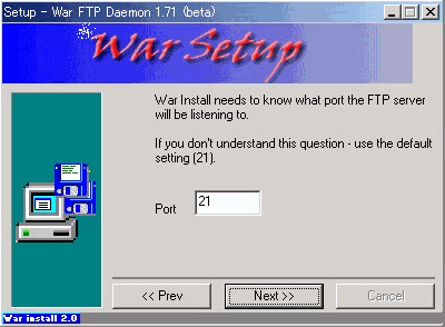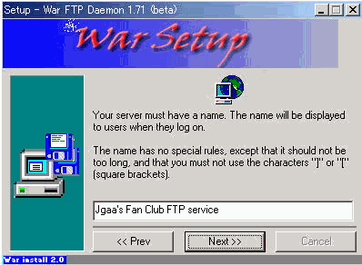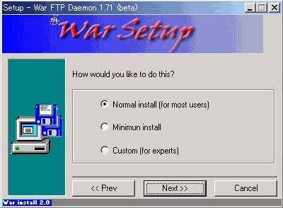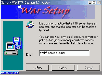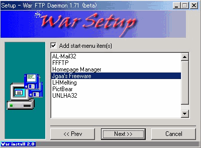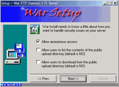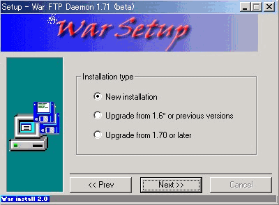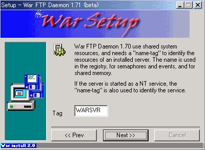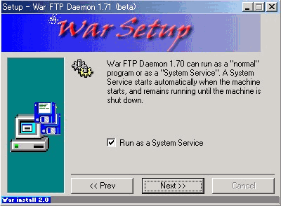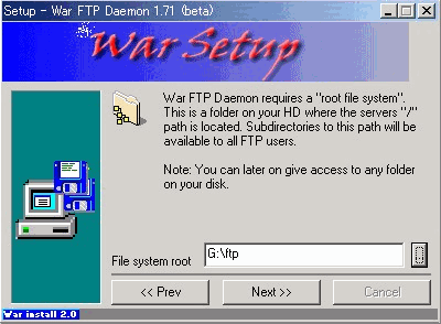 WarFTPdのインストールそのものについては、下記のとおりNT系と全く同じ方法で問題ありません。但し、ひとつだけ注意点があります。それは、最後のインストールフェーズのところが非常に時間がかかり、一瞬固まってしまったのかと思えますがじっくりと待ってください。インストールされるはずです。