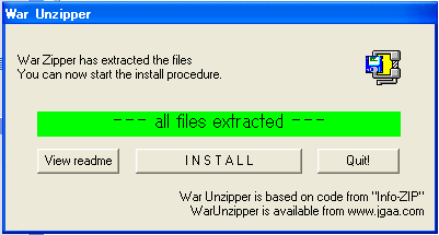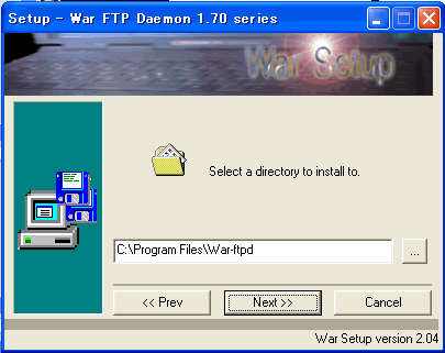 - ダウンロードした warftpd-1.82-00-RC9-i386.exe を実行し、インストールする。ファイルは自己解凍形式の圧縮ファイルになっており、実行すると解凍されると共にインストーラが起動するので、指示に従いインストールする。