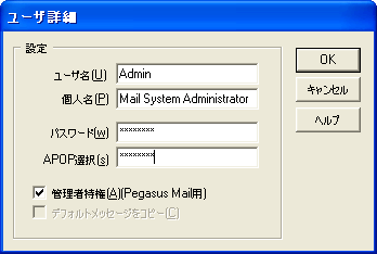 - ユーザの詳細画面が表示されるので、「パスワード」にパスワードとAPOPを使用するなら「APOP選択」にAPOP用パスワードを入力し、「OK」を押す。Adminユーザは、「管理者特権
