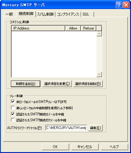 ここで、リレー制御の設定で、デフォルトで「非ローカルメールのSMTPリレーは不許可」がチェックされているが、更に、「認証されたSMTP接続はメールを中継」にチェックを入れる。