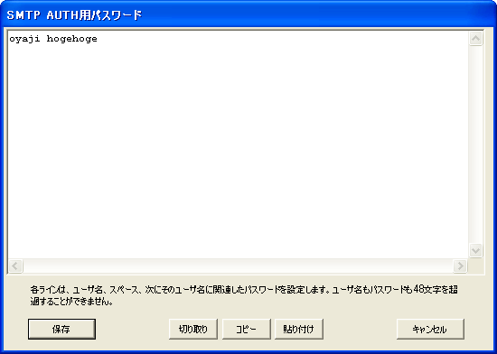 - 2項の「AUTHパスワードファイル」欄脇にある「編集」ボタンを押すと、登録したパスワードファイルが開くので、1行ごとにユーザ名とパスワードを空白を挟んで記述していく。MD5の場合は、下記でhogehogeの代わりに4項で作成したパスワードをコピペすればよい。全て記述したら、「保存」を押して親画面(2項)で「OK」を押して閉じれば設定は完了である。