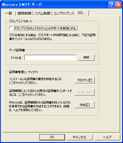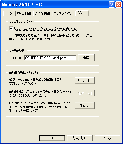 事前準備としてSMTP AUTH 用パスワードファイルと同様に、MercuryS SMTPサーバの管理ツールでは予めファイルがないと扱えないので、任意の場所に空の証明書ファイルを作成しておく。おやじは、C:\MERCURY\SSL\mail.pemを作成した。その後、メイン画面から、「設定」->「MercuryS