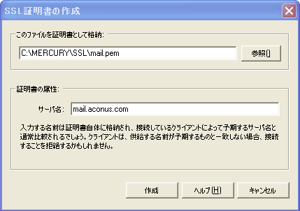 - 証明書管理ユーティリティの「作成」ボタンを押すと、以下のような画面が表示される。「このファイルを証明書として格納」欄に証明書までのパスを指定し(名前は任意。おやじは、C:\MERCURY\SSL\mail.pemとした。)、サーバ名にインターネット上のサーバ名(コアモジュールで指定したものと同じ。)を入力して、「作成」ボタンを押す。