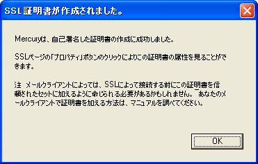 - 上記画面が閉じると、7項の画面に戻るが、サーバ証明書欄に今作成した証明書のパスが入っているはずである。ここで、一応、「プロパティ」ボタンで証明書の内容を確認しておこう。確認が済んだら、「SSL/TLSサポート」にチェックを入れ、「OK」を押せばSMTPのSSL化は完了である。