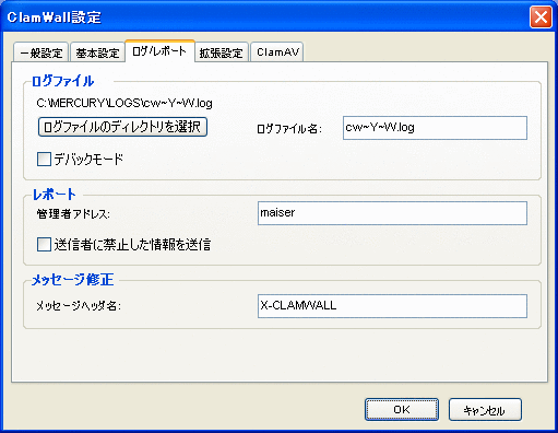 | 1 | 変更前 | LogFile "C:\Program Files\clamAV\log\clamd.log" | パスをインストール時に変更した "C:\MERCURY\CLAMAV" に変更。 |