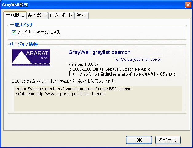 なお、プロバイダアカウントのメールをMercuryDのPOPクライアント機能で受信してから配送すればウイルススキャンできるので、ぜひ導入すべきである。3 GrayWall グレイリストによるスパム対策アドインである。本機能は、メールが送られてくると1回目は受信せず拒否(コード:451)し、リトライしてきた2回目のメールを受け取るというものである。これは、スパムは一般的にメールを拒否されてもリトライしないという特徴を利用したスパム対策機能である。一度受け取ると、ホワイトリスト扱いになるので遅延しなくなる。