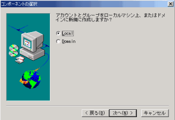 「NTアカウントとグループを作成する」を選択した場合は、アカウントをローカルマシン上かドメインに作成するかを設定する。おやじ宅は、ドメイン運用ではないため、ここはローカルとした。
