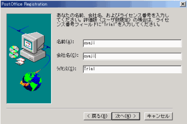 ここでは、Post.Officeを利用するための所有者情報を登録する。名前や会社名などを入力する。ライセンス番号は評価版として利用するので、 「Trial」 のままとした。