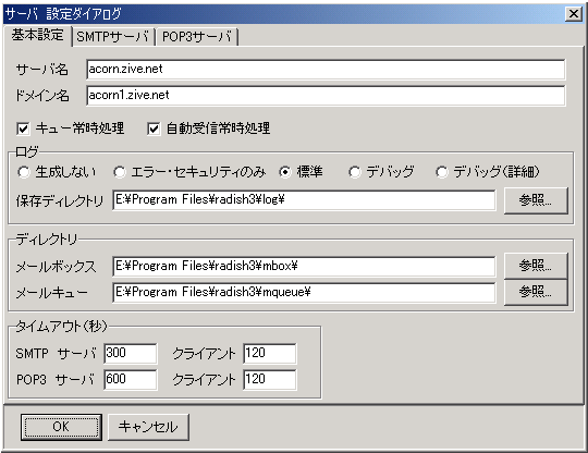 「設定」→「サーバ」でサーバの基本的な設定を行う。基本設定では、サーバ名とドメイン名を設定する。必要により、ログやメールボックス等のディレクトリを変更する。ここで、気をつけるのはドメイン名を、存在しないドメイン名とすること。これは、自ドメインのメールも既存SMTPサーバに送るための設定であり、SMTP-HUBとして利用する場合に限る。通常は、自分のドメインとすること。(下記では、example1.zive.netとしているが、絶対に存在し得ないドメイン名にすること。)