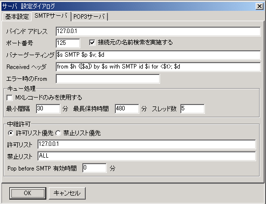 デフォルトで何も入っていないので、SMTP-HUBとして利用する場合はそのままとする。通常のメールサーバとして利用する場合は、127.0.0.1と、POP3サーバが待ち受けるネットワークカードのアドレス(サーバのアドレス)をスペースで区切って設定する。