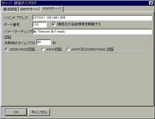- 「POP3サーバ」タブを選択し、設定を行う。SMTP-HUBとして利用する場合は、本設定は不要。