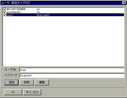 - 「設定」→「ユーザ」でユーザの設定を行う。SMTP-HUBとして利用する場合は、本設定は不要。