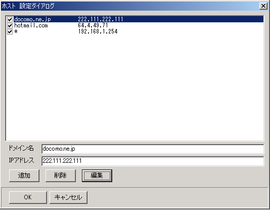最後に、ドメイン名を「*」、IPアドレスとして現在利用しているSMTPサーバのアドレスを登録する。案1の場合はメールサーバのアドレス(現在、メールクライアントのSMTPサーバに設定されているものと同一)を、案2の場合は、127.0.0.1を登録する。通常のメールサーバとして利用する場合は、本登録は不要。docomoやhotmailは必要。これにより、送信先ドメインがdocomo.ne.jpやhotmail.comの場合は、登録されているIPアドレスにリレーし、これらにマッチングしなかった残りのドメインは、現在利用しているSMTPに転送される。登録順序が重要であり、「*」設定は最後にすること。