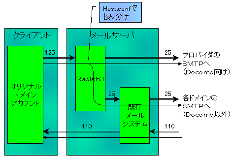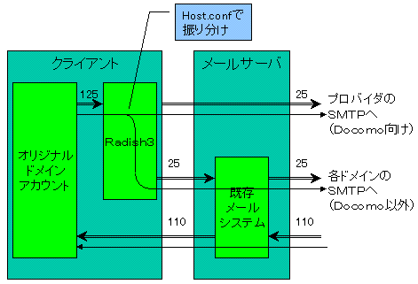 - 案1(クライアント方式)は、現在利用しているMTAはそのままで、クライアントにRadish3をインストールし、メール送信時にRadish3で受け、docomo向けは契約プロバイダに送り、残りは現在利用しているMTAに送り、後は任せる方法です。イメージは下記のとおりです。
