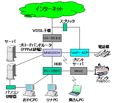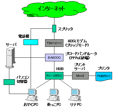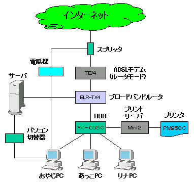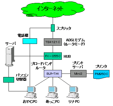 現サーバと今は姪っ子が使用しているFMV(Pentium !! 233MHz)の2台で、HUBとプリントサーバを購入してLANを構築。あっこの部屋まで薄いLANケーブルを絨毯を剥がして設置したが、ドアが閉まらないはめに。主に使用していたのは、おやじとあっこ。