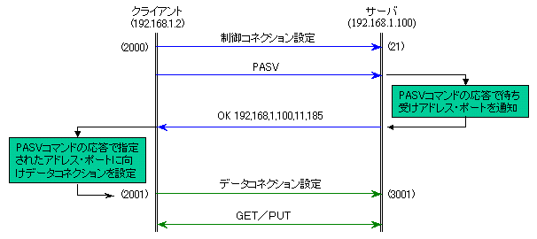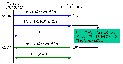 ここで注意が必要なのは、データコネクションの設定方向であり、ファイルをダウンロードするのかアップロードするのかにかかわらず、サーバ側からコネクションが設定されるということである。ファイルをアップロードする場合は、クライアントから通信が始まるように思えるがこれは誤りである。このデータコネクションの設定方向は、ルータのフィルタリングやポートマッピング(スタティックNAT)の設定に関係してくる。