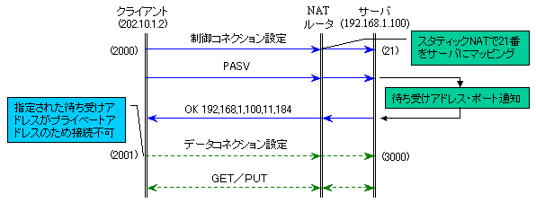 このケースでは、クライアントからのPASVコマンドに対してサーバは自身のプライベートアドレスを待ち受けアドレスとして返してしまうので、クライアントからは接続しようがない。
