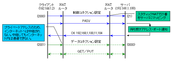 自宅FTPサーバに、企業内やユーザやADSLユーザ等のNATルータ配下のクライアントがアクセスする場合等に相当する。 |