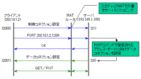 ・家庭内からのアクセスは、PORTモードのみとなる。PASVモードでアクセスすると上記設定で動作するため、ルータのWAN側アドレス(グローバルアドレス)が通知されてしまい、アクセスできなくなる。