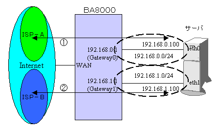 BA8000Pro)のポリシールーティングで、動的IPのISP-Aはクライアント専用とし、固定IPのISP-Bはサーバ専用とすることにしました。しかし、せっかく回線が2回線あるのに勿体ないので、何とか両方を使えないか検討した結果、iproute2を使ったポリシールティングでマルチホーミングを実現しました。なお。この方法はサーバ側だけでの対策なので、何もルータはBA8000である必要はありません。