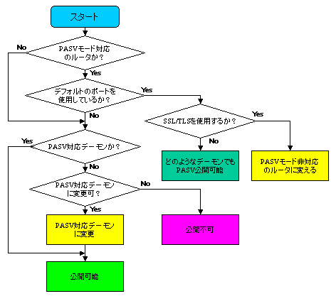 従って、このような機能があるルータを使用している場合は、デーモンを含めて特に対策を施さなくてもNATルータ配下でFTPサーバをPASVモードで公開できる。(NATルータ対策が可能なデーモンであっても動作がおかしくなるので、この場合は対策しないこと。) 但し、デーモンでデフォルトの21番を使用していないとFTP通信として認識できないので、この機能は動作しない。また、FTPをSSL/TLSで使用する場合は、パケットが暗号化されるので中身が分からなくなり、変換できないため、このようなルータを使用しても駄目である。
