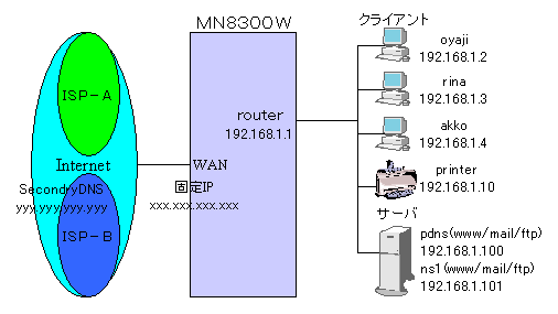 一方、もう一社の固定IPサービスにも加入して独自ドメインを取得しており、こちらについては、外向きと内向きにDNSを動かしています。