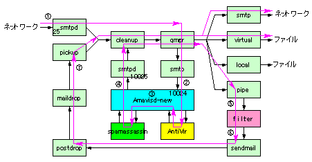 バーチャルドメイン対応のPostfix + Amavisd-new + AntiVir + Spamassassin 時のメール配送フローを整理してみました。
