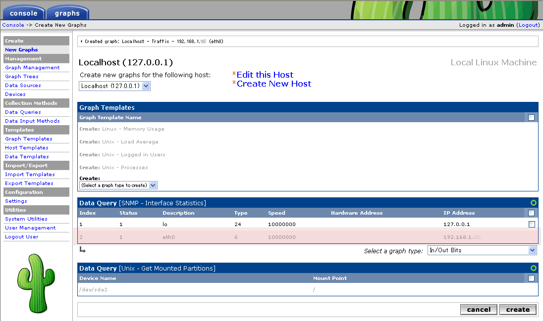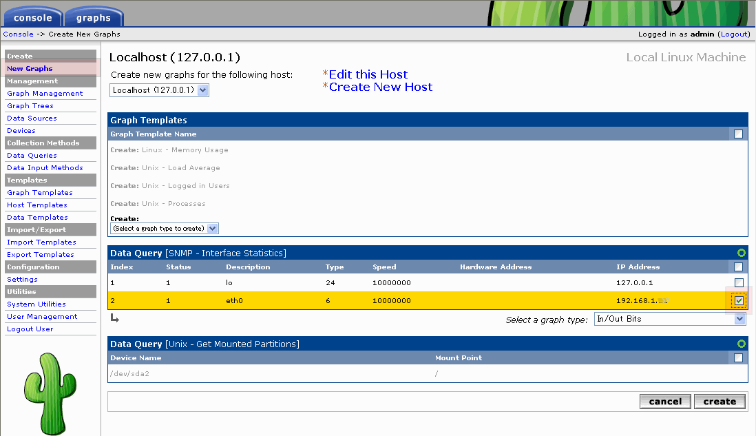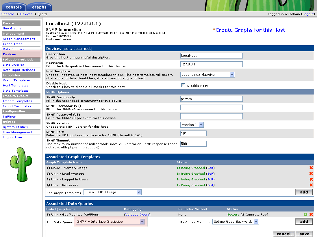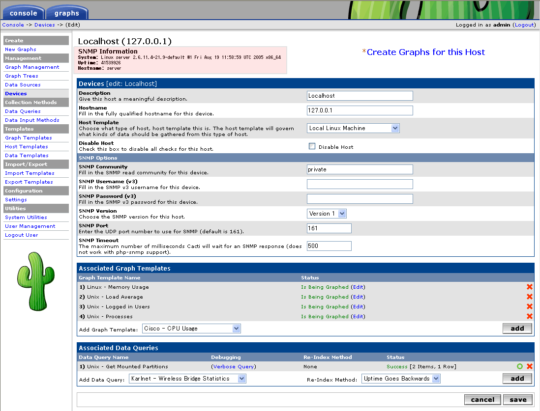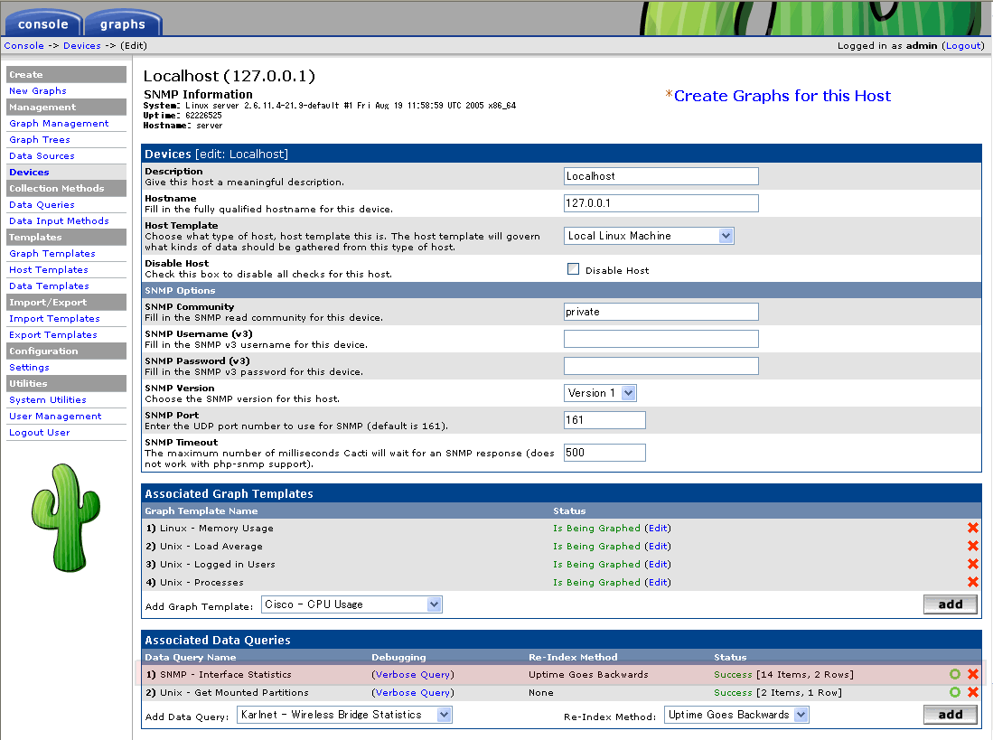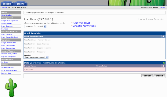 続けて監視対象の設定を行っていきますが、Cactiにはデフォルトで典型的なテンプレートが用意されているので、まずはこれを利用した簡易監視を行うことにします。後半では、自作スクリプトを利用した監視についても触れることにします。