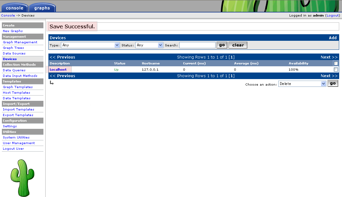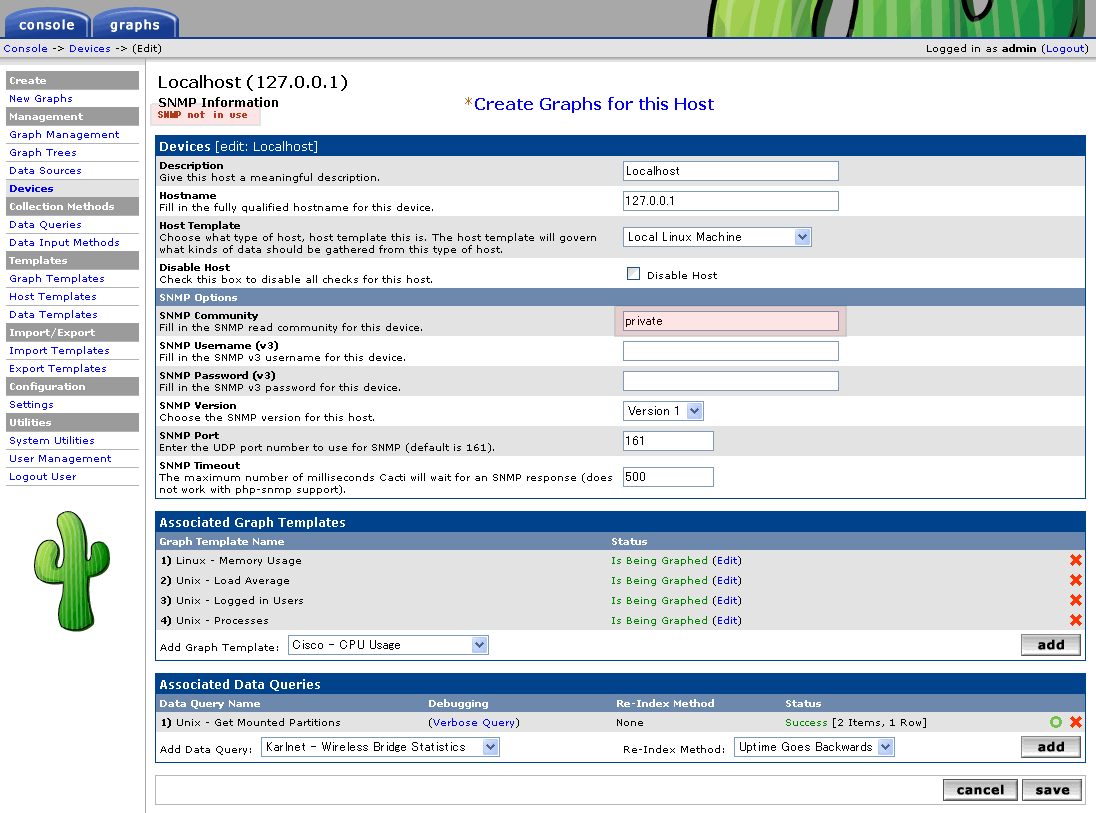 続けて監視対象の設定を行っていきますが、Cactiにはデフォルトで典型的なテンプレートが用意されているので、これを利用した簡易監視を行うことにします。