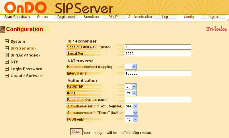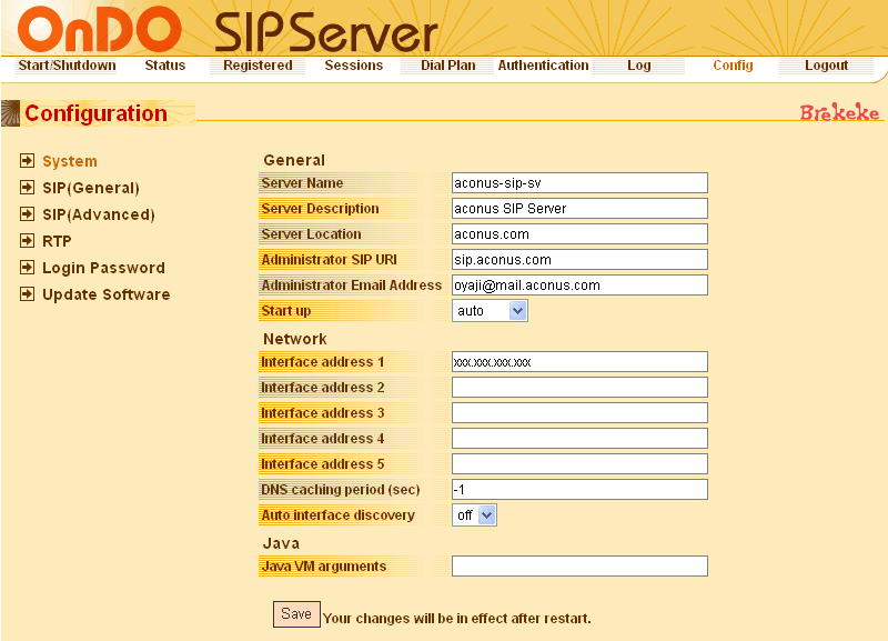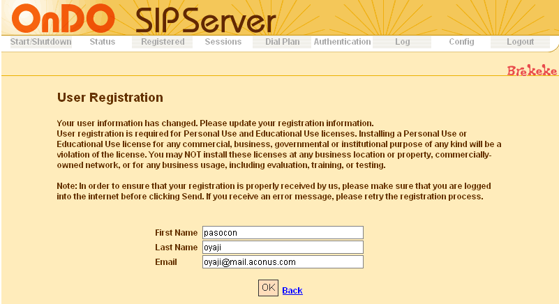 OnDO SIP Serverの設定はドキュメントを見れば、ほとんど迷うことはないと思います。以下は、おやじが設定した内容を簡単に記述しておきます。