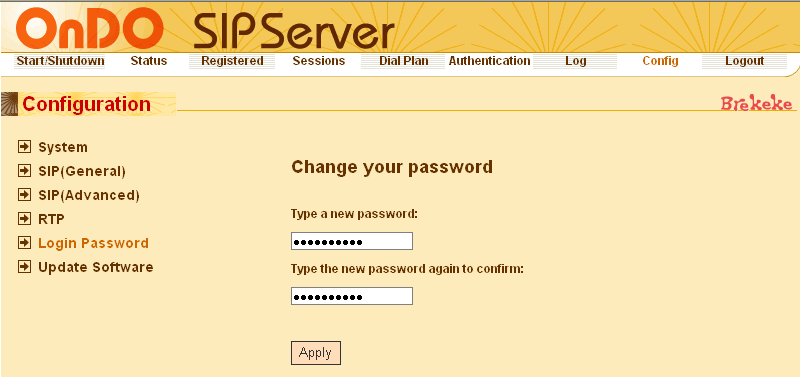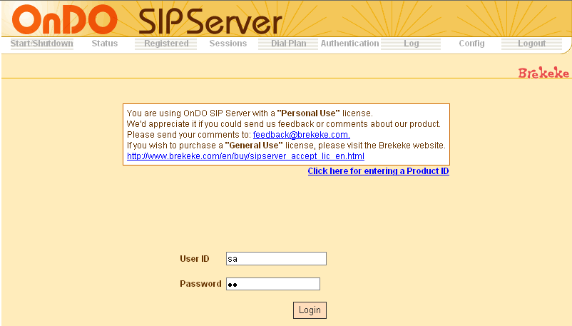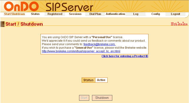 - ログイン画面が表示される。「Status」が「Active」になっていれば、OnDO SIP Serverは正常に起動されている。「Inactive」になっている場合は起動に失敗しており、Statusの上にエラーが表示されるので、brekekeのホームページにあるFAQを参考に確認する。正常に起動しているなら、「Shutdown」をクリックしてStatusが「Inactive」に、「Start」をクリックしてStatusが「Active」になることを確認しておく。