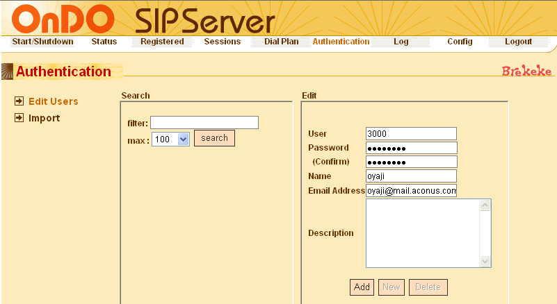 - 右側の「Edit」欄に、登録するユーザ(User:実際に呼び出しに使用するダイヤル番号)とパスワード(Password)、表示名(Name)とメールアドレス(Email