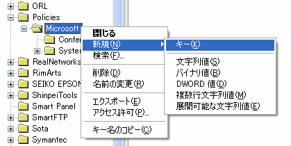 - 「HKEY_CURRENT_USER\Software\Policies\Microsoft」の上で右クリックし「新規」 -> 「キー」と選択しクリックする。