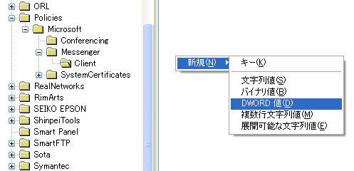- 「Client」キーを選択し、右欄の空白領域で右クリックして「新規」->「DWARD値」を選択する。