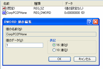 - 「新しいキー」の名称を「CorpPC2PHone」に変更し、「CorpPC2PHone」上で右クリックして「修正」を選択し、「値のデータ」を"1"に変更して「OK」をクリックする。後は閉じればよい。