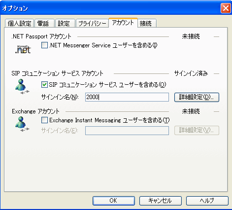 - Windows Messenger の「ツール」->「オプション」を選択し、「SIP コミュニケーション サービス アカウント」 で 「SIP