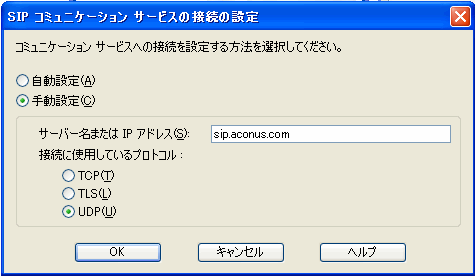 - 「詳細設定」をクリックすると下記画面が表示されるので、「手動設定」を選択し、「サーバー名または IP アドレス」にSIPサーバ名(家庭内端末の場合、内向きDNSがなかったりhostsで名前解決ができないならアドレス指定する。)、「接続に使用しているプロトコル」でUDPを選択し、「OK」をクリックする。
