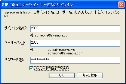 - 初回サインイン時に下記画面が表示されるので、「ユーザ名」と「パスワード」を設定し、「OK」をクリックすればSIPサーバに接続される。