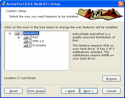 - 途中で、インストール先をC:\perlからC:\usr\localに変更してインストール。(おやじはこれで苦労した)