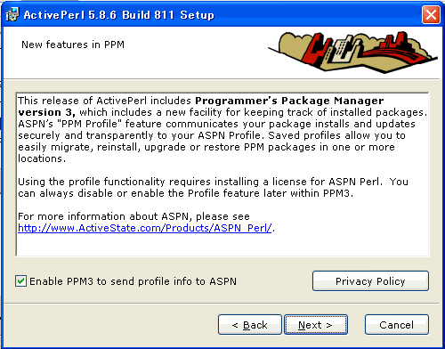 info to ASPN」にチェックを入れインストールを続行する。PPMを有効にしておくと後でいろいろなperlモジュールが必要になったとき簡単にインストールできる。